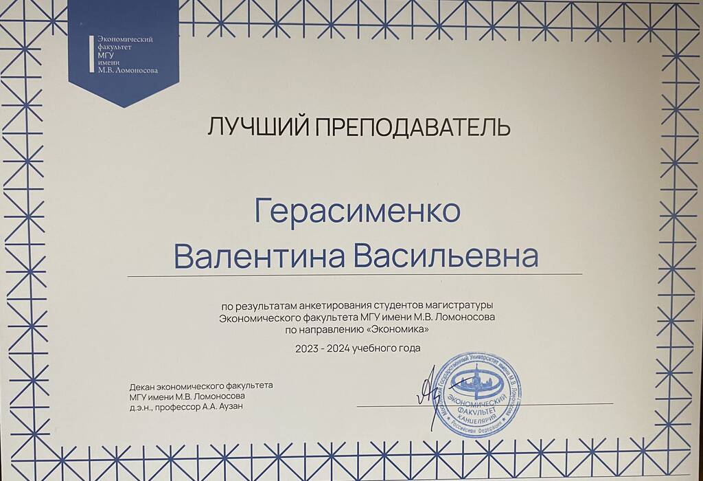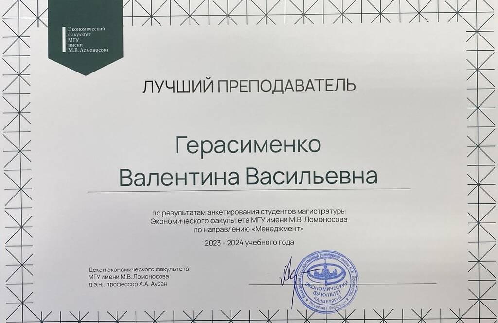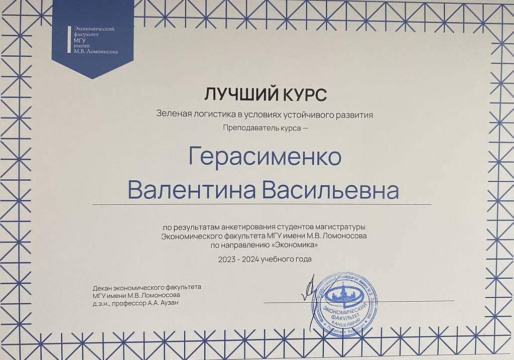 Зав. кафедрой маркетинга проф. Валентина Васильевна Герасименко была признана лучшим преподавателем магистратуры по направлению "Менеджмент" и "Экономика", а ее курс "Зеленая логистика в условиях устойчивого развития" - лучшим курсом по результатам анкетирования студентов магистратуры по направлению "Экономика".