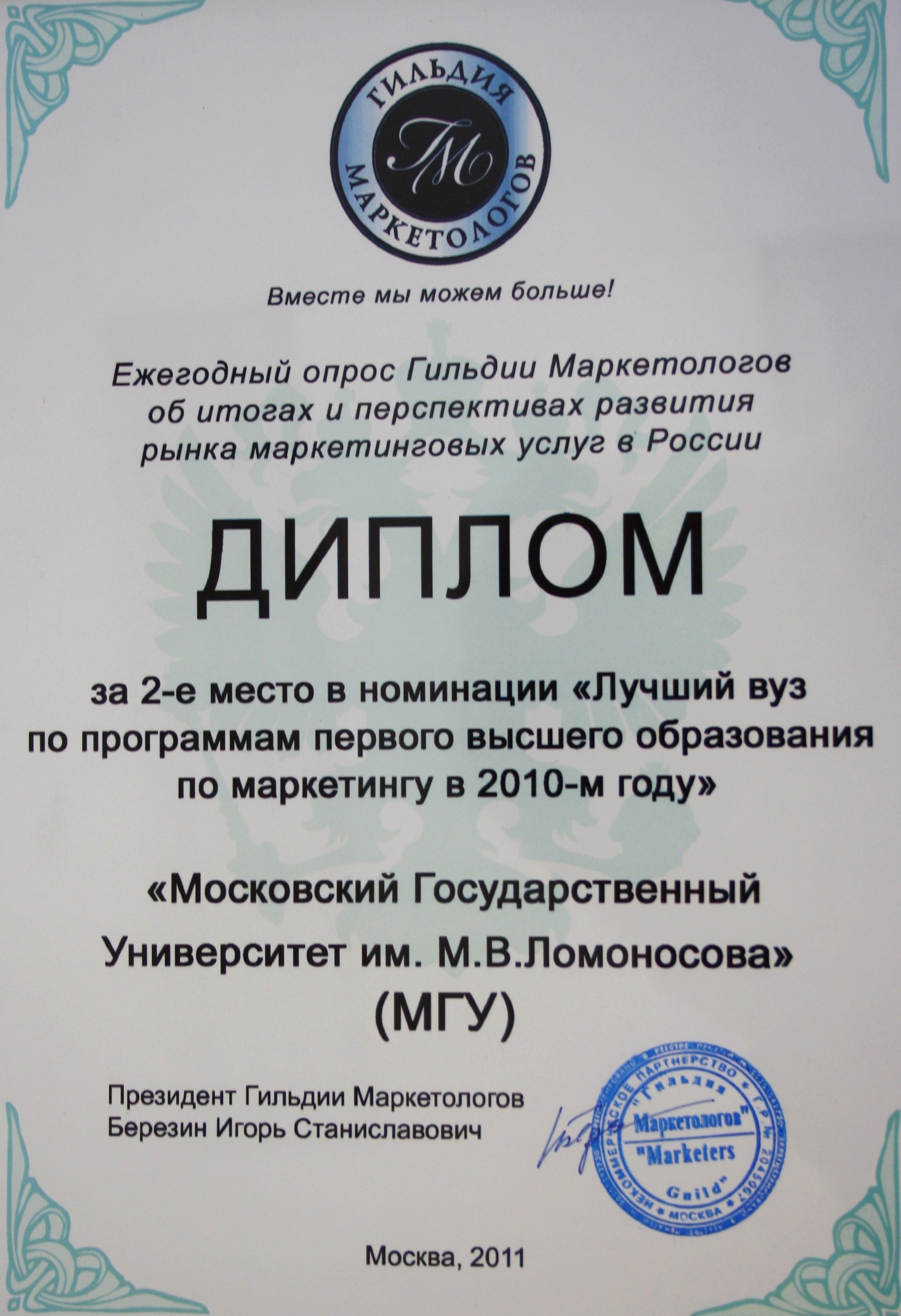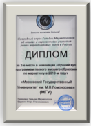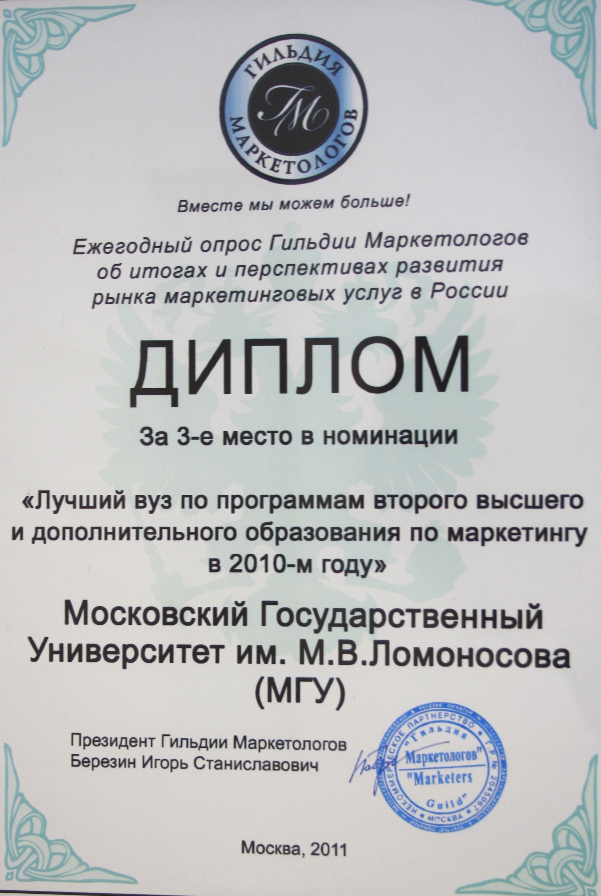 Гильдии маркетологов удостоила кафедру маркетинга дипломами в номинации "Лучший вуз по программам первого высшего образования по маркетингу в 2010-ом году" (второе место) и в номинации "Лучший вуз по программам второго высшего и дополнительного образования по маркетингу в 2010-ом году" (третье место).