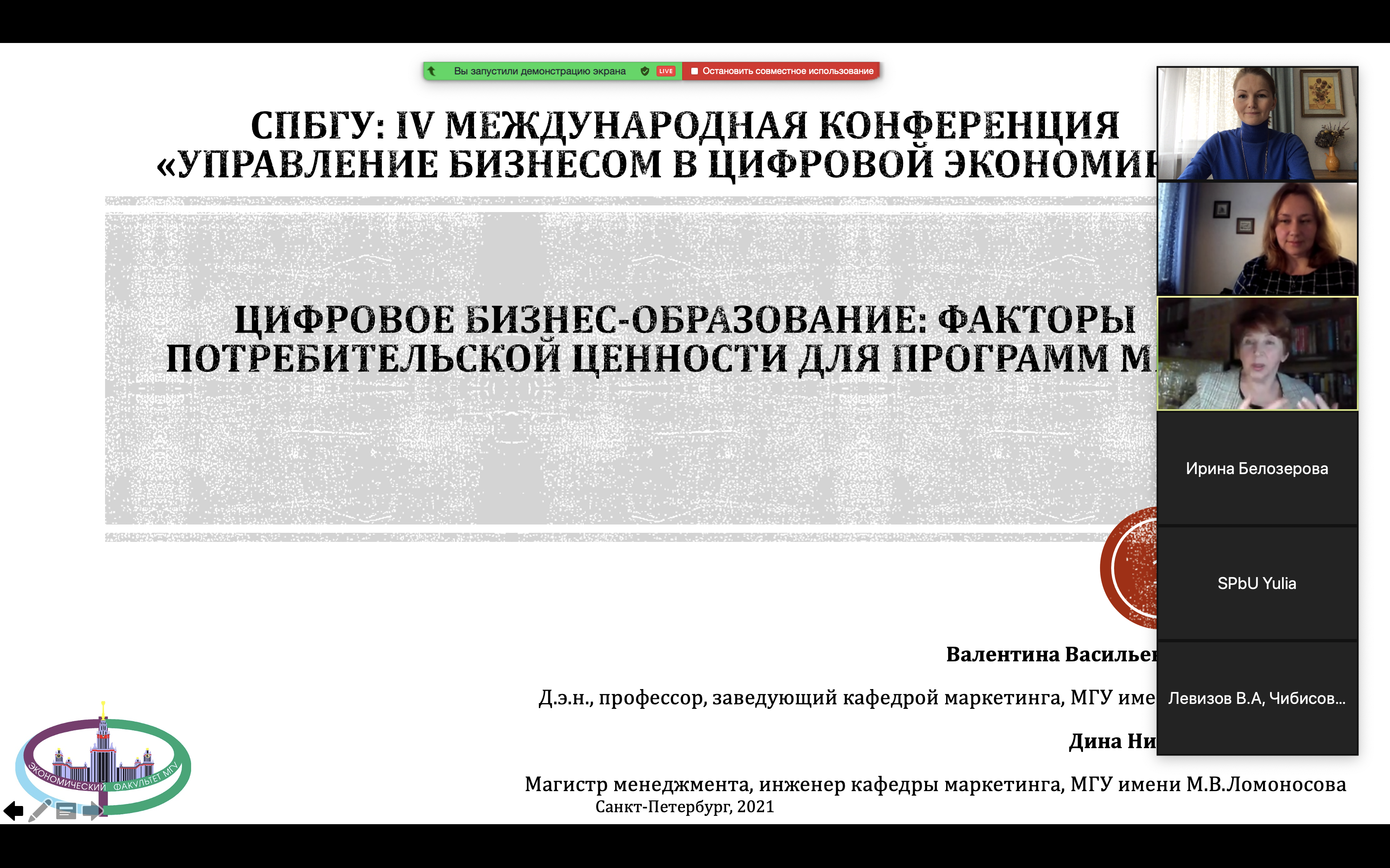Зав. кафедрой маркетинга проф. Герасименко В.В. и инженер Куркова Д.Н. выступили (онлайн) на конференции на IV международной конференции «Управление бизнесом в цифровой экономике» в СПбГУ с докладом "ЦИФРОВОЕ БИЗНЕС-ОБРАЗОВАНИЕ: ФАКТОРЫ ПОТРЕБИТЕЛЬСКОЙ ЦЕННОСТИ ДЛЯ ПРОГРАММ МВА"